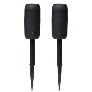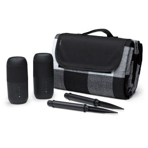 Set includes: 2 x Bluetooth / solar powered speakers with 2 x removeable stakes and outdoor blanket
