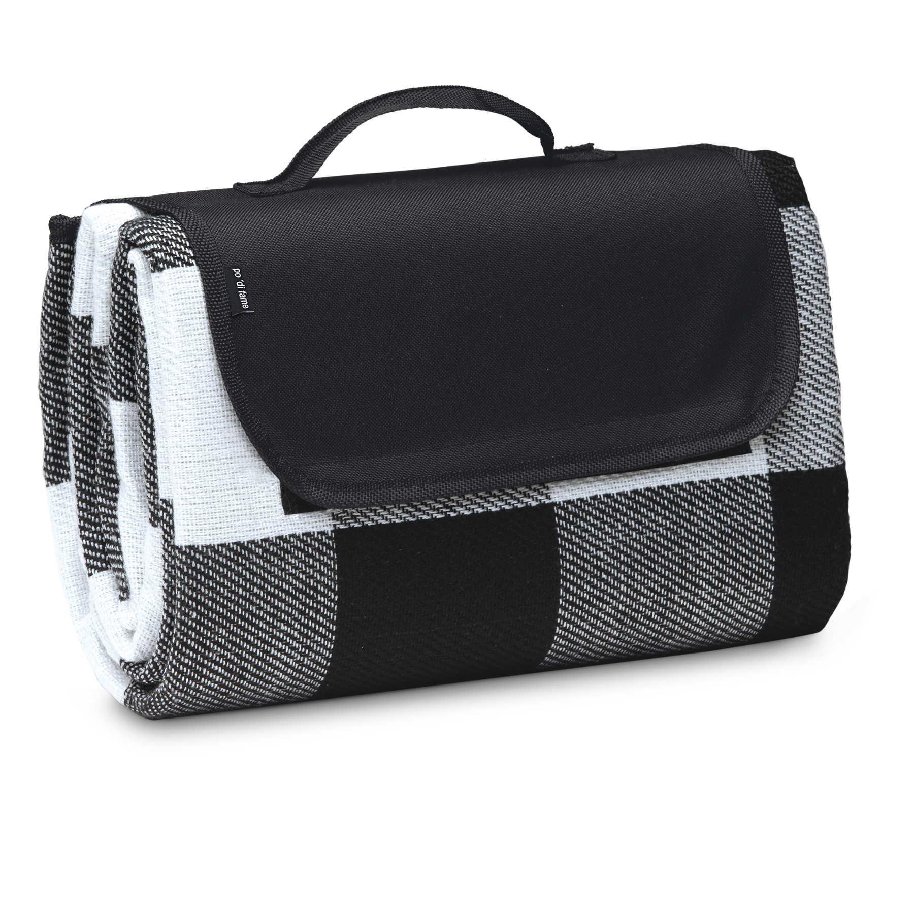 Polyester black/white check blanket with Velcro closure and carry handle