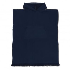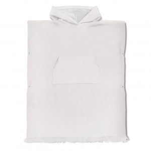 Convenient hooded towel made of 320gsm, 100% cotton. With a fringe trim and kangaroo pocket, this towel is both absorbent and stylish. It has side snaps, terry on the inside, and a flat weave on the outside.