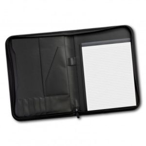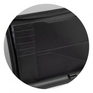 Travel-inspired portfolio case made of PU with foldaway handles. It has a zipped closure as well as two external and three internal document slips. Internal pen loops, a passport/ticket holder, a tablet slip pocket, and six business card holders are also included in the portfolio.