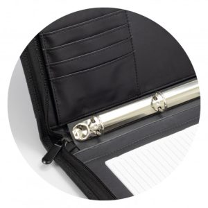 Professional portfolio manufactured from PU with removable metal ring binders. It features a zippered closure for added security and convenience. The portfolio also includes internal loops for pens and flash drives, as well as large document slips and three business card holders.