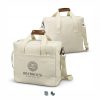 Stylish double wine cooler bag that will hold two standard wine bottles. Colton features PE foam insulation encased in a water-resistant PEVA inner liner, and the outer construction is natural 100% 450gsm cotton canvas with stunning leather-look PU accents. It has a webbed cotton carry handle with a PU cuff and a removable, adjustable shoulder strap. Other features include a zippered top closure, piping details to hold the structure and a large slip pocket.
