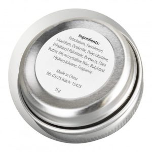 Handy 15g vanilla-scented lip balm in a convenient travel tin with a secure screw on lid. An ingredients label is located on the base of the tin.