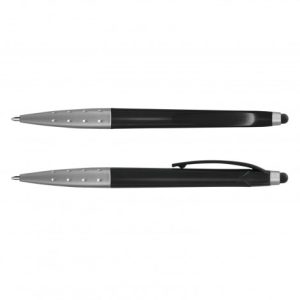 Twist-action plastic ballpoint pen with a metallic barrel, metallic silver trim and a stylus for use with touch screens. It has a black refill with 500 metres of writing ink and can be presented in an optional pen sleeve.